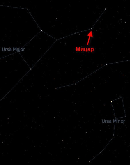 Большая и Малая Медведицы. Звезда в “ручке” ковша Болшой Медведицы является тройной системой. Невооруженным глазом можно различить две звезды (Мицар и Алгол), а третья видна только в телескоп.