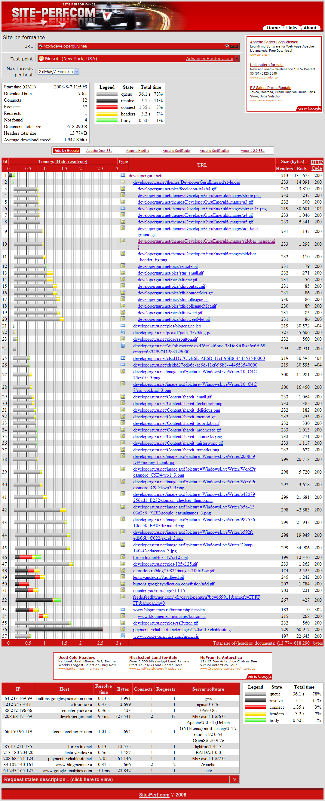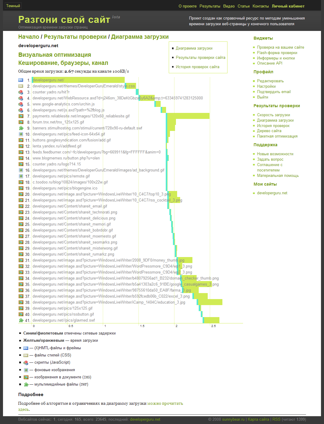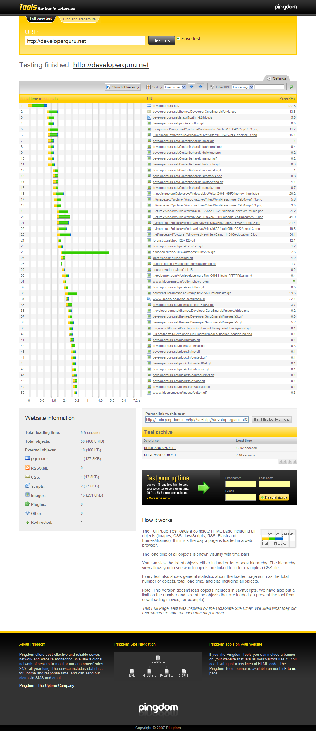 Сервис по функциональности похож на предыдущие, но отображает результаты в табличном, далеком от веб-два-нольности виде. В конце дает оценку и рекомендации по каждому типу файлов (скрипты, картинки и т.п.). Может использоваться только как еще один инструмент, в дополнение к уже рассмотренным.